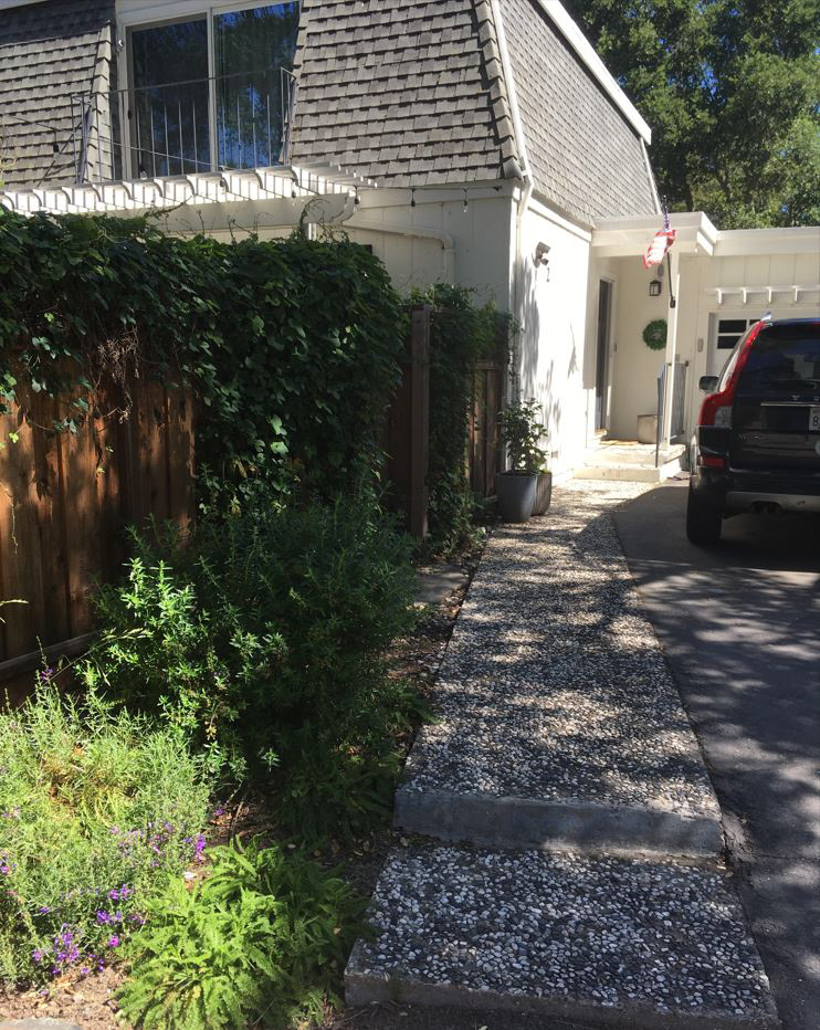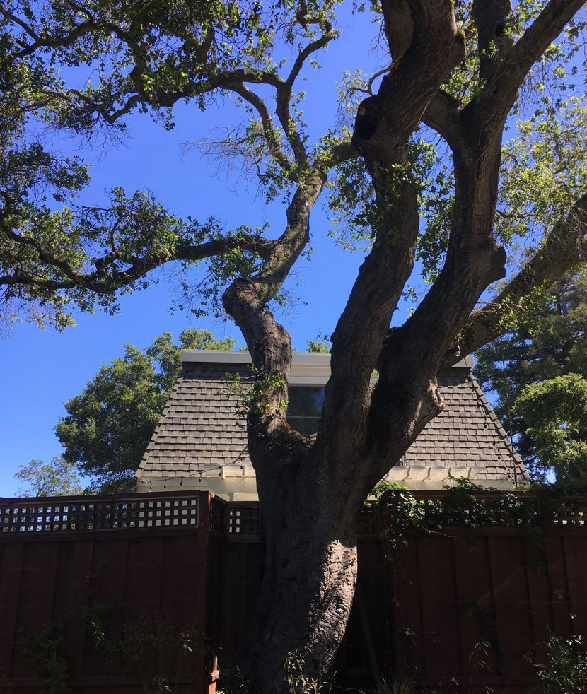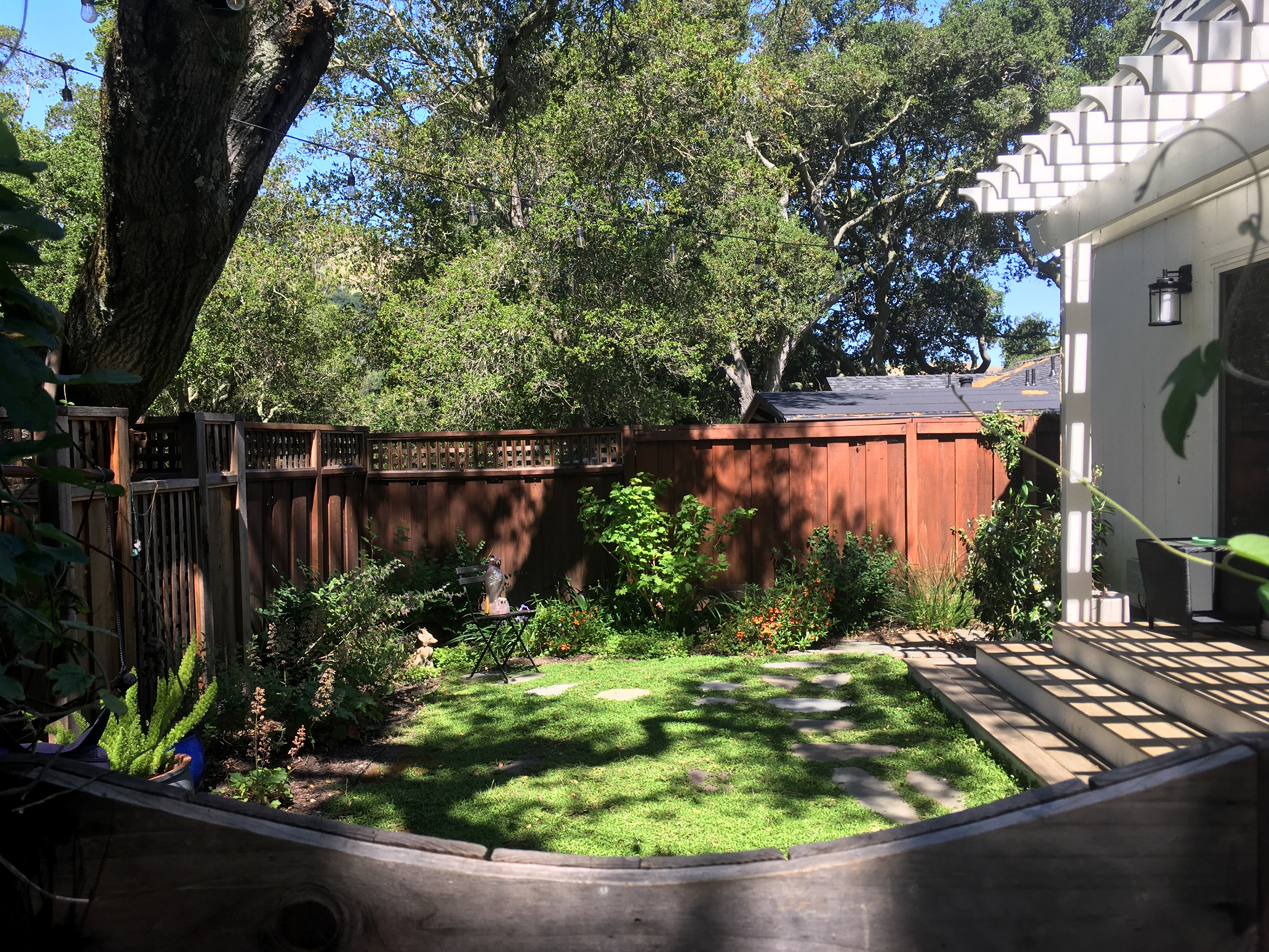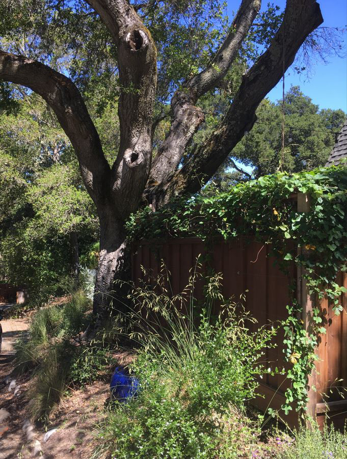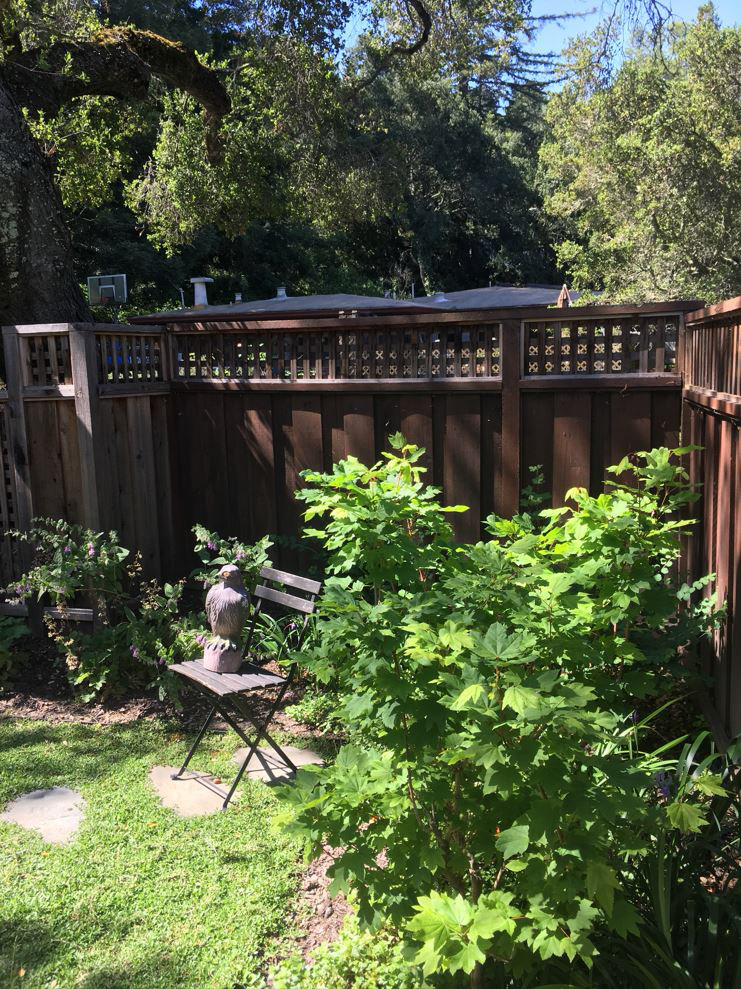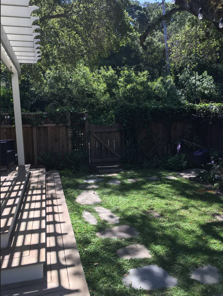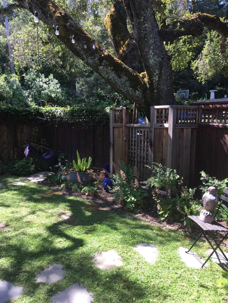 An grand old Coast Live Oak stands sentinel over this tiny garden, providing an opportunity to create a shady low-water native plant habitat (Vine Maple, Snowberry, Sword Ferns, Douglas Iris, Pitcher Sage, Coral Bells etc.), as well as a small family play space using drought-tolerant Kurapia. The mansard roof and Live Oak provided the opportunity to play with scale, form and enclosure using new carpentry elements to create a sweet private refuge outside the home's living room doors.