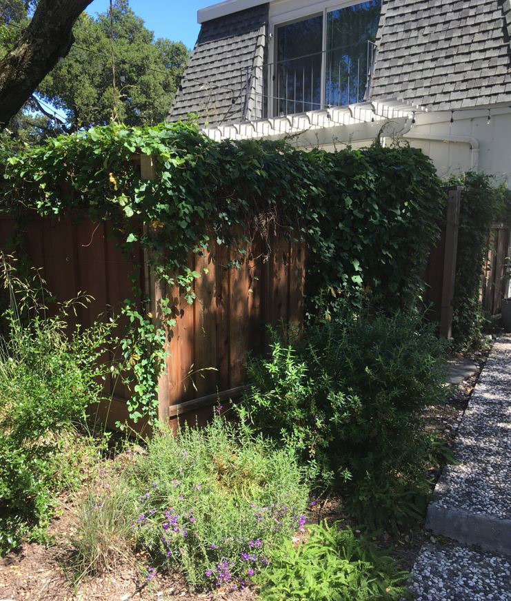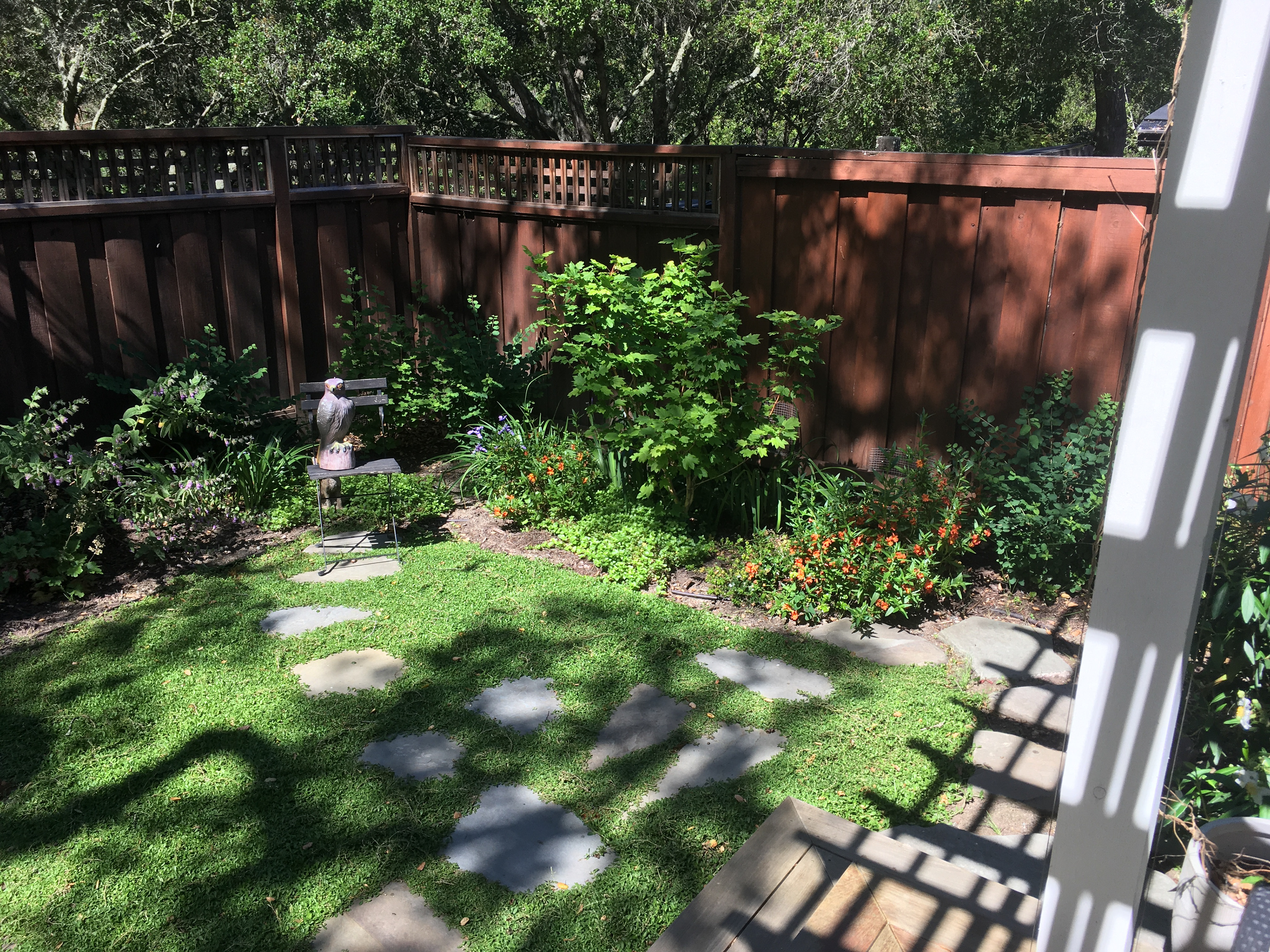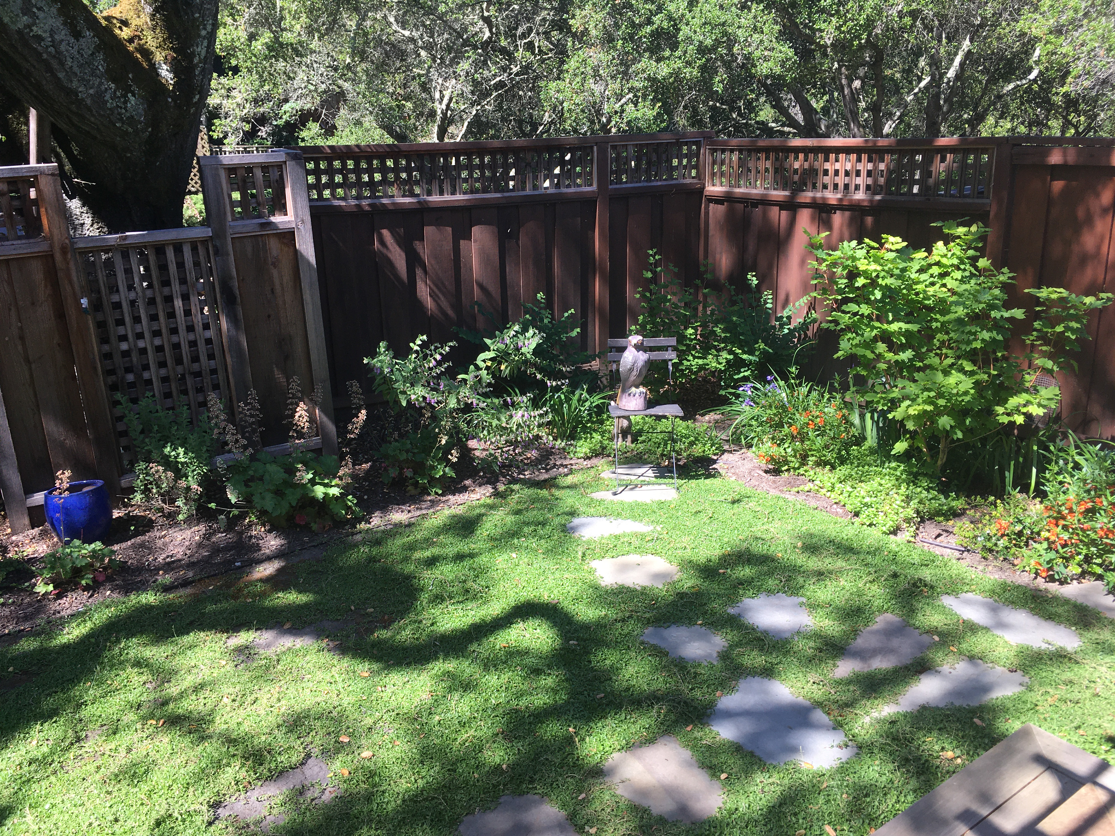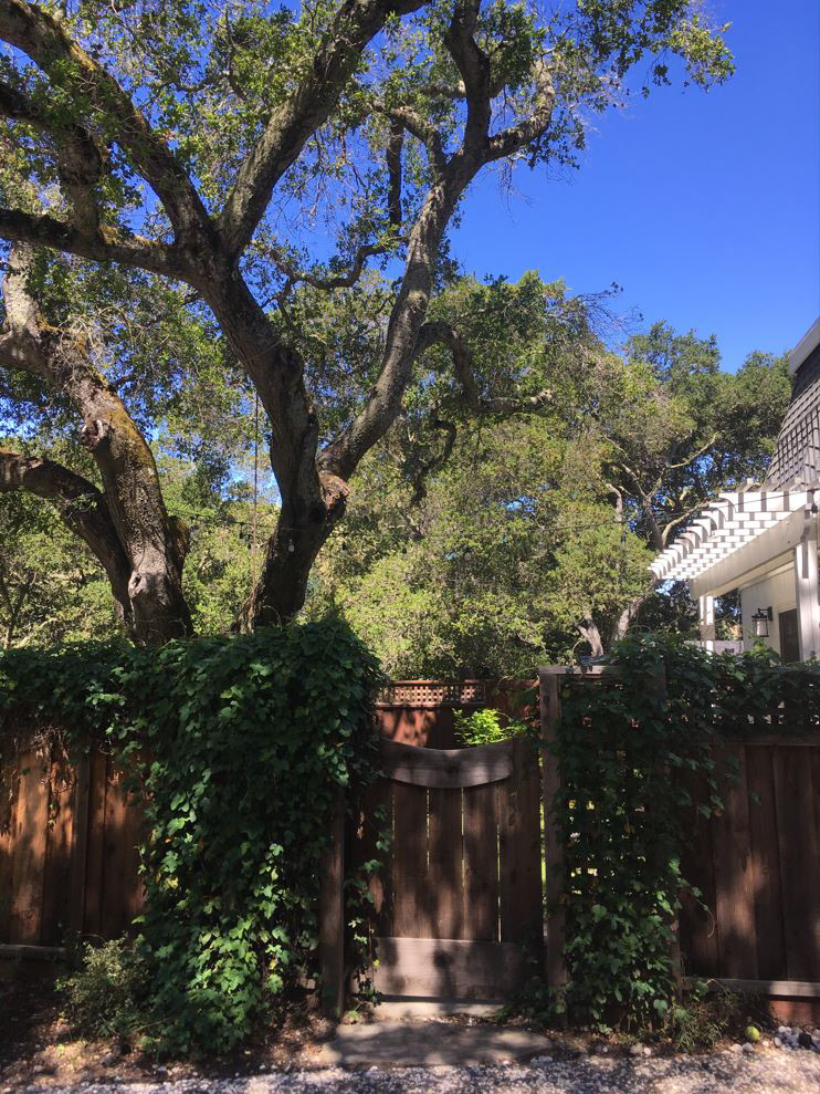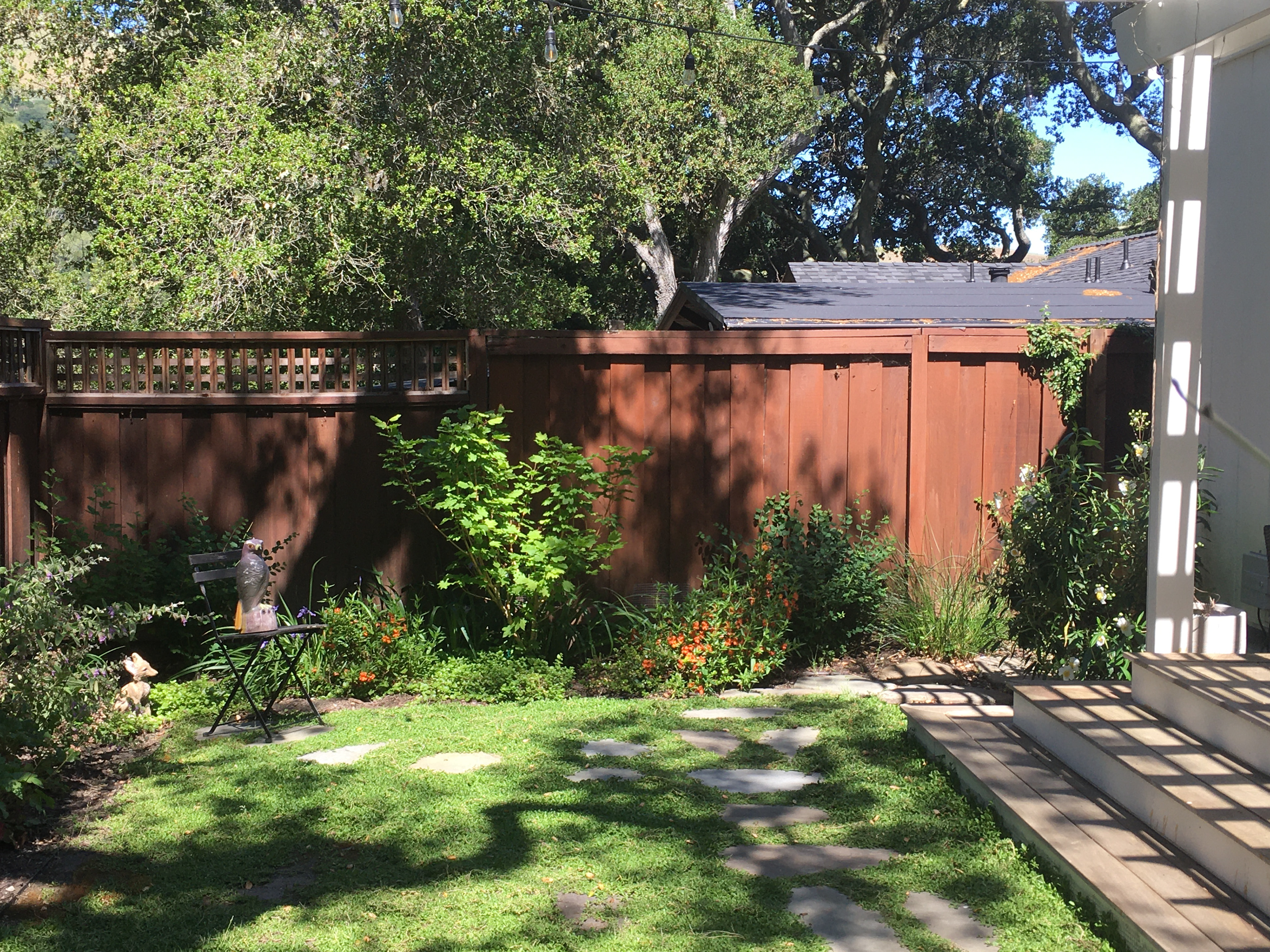 An grand old Coast Live Oak stands sentinel over this tiny garden, providing an opportunity to create a shady low-water native plant habitat (Vine Maple, Snowberry, Sword Ferns, Douglas Iris, Pitcher Sage, Coral Bells etc.), as well as a small family play space using drought-tolerant Kurapia. The mansard roof and Live Oak provided the opportunity to play with scale, form and enclosure using new carpentry elements to create a sweet private refuge outside the home's living room doors.