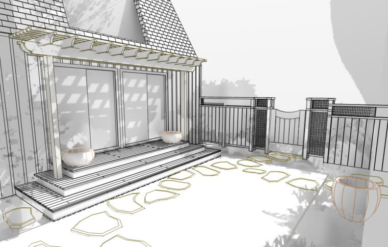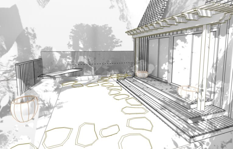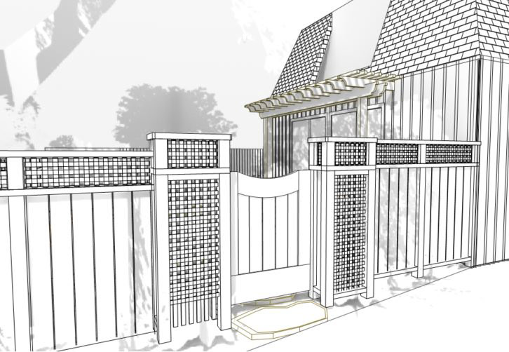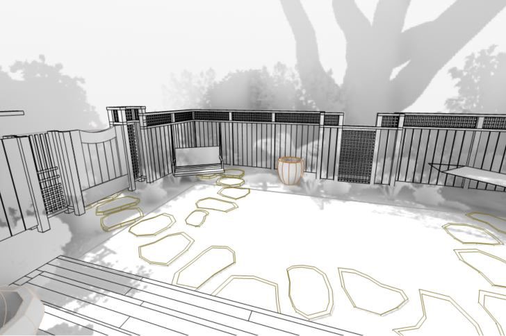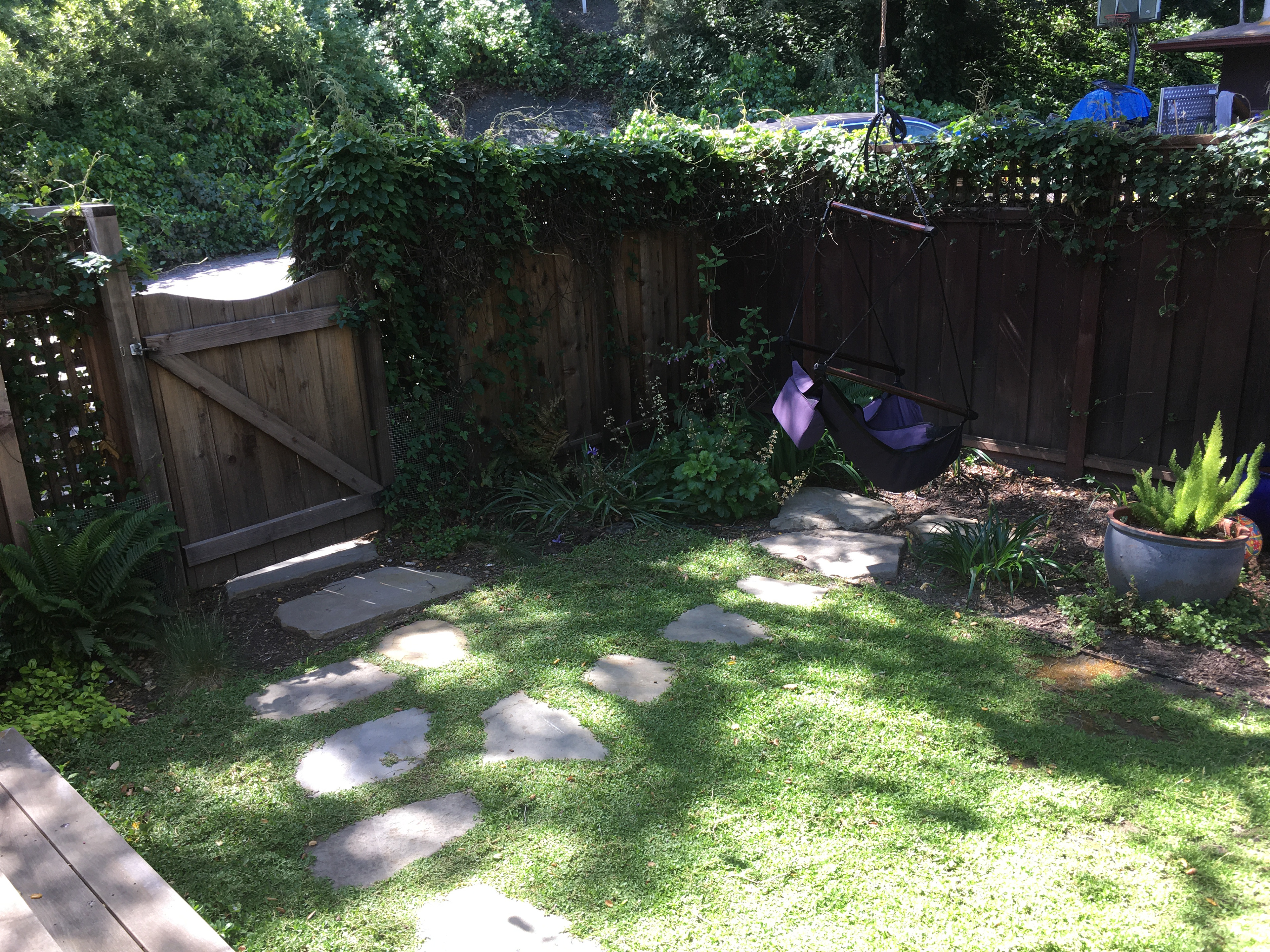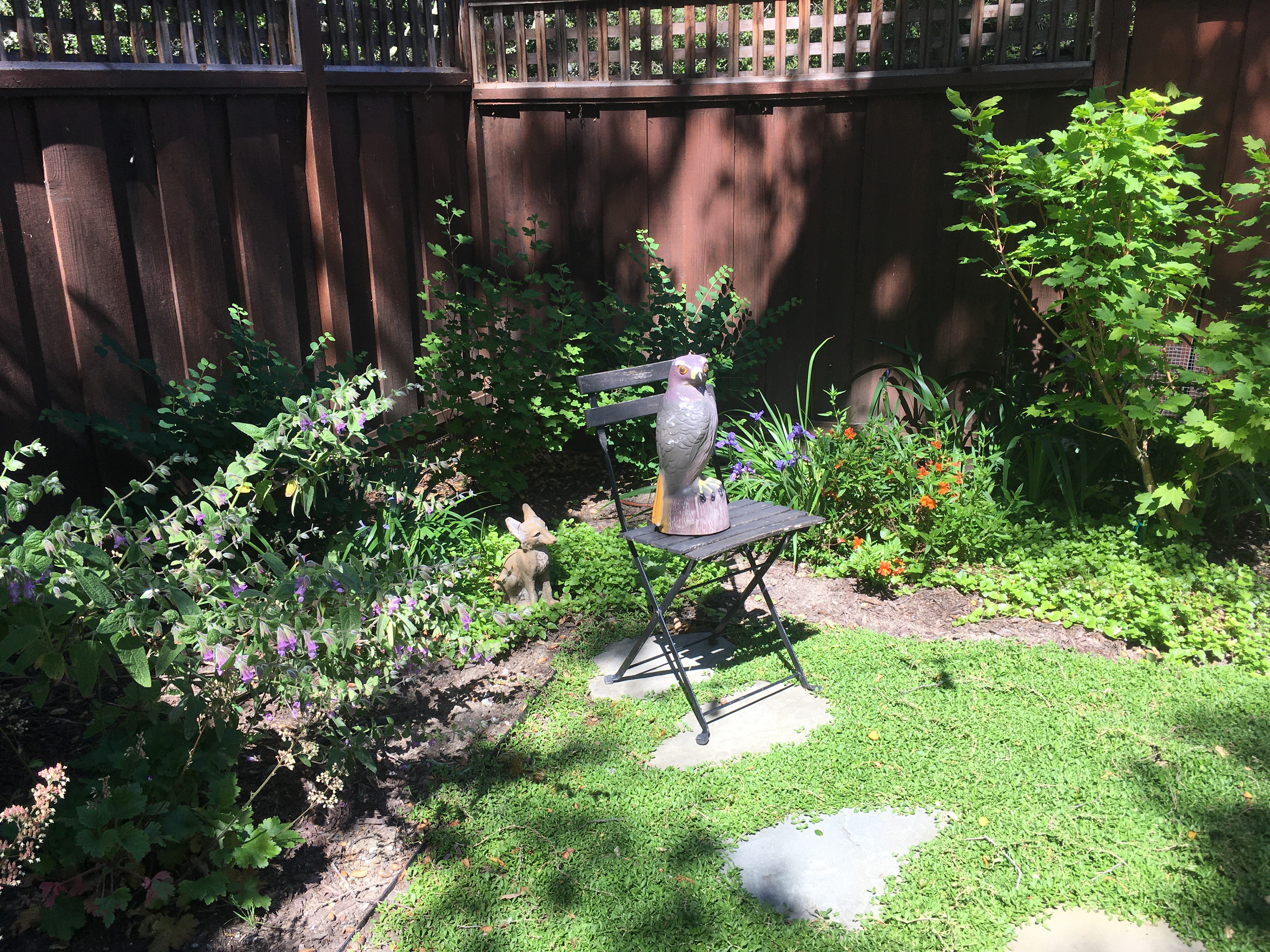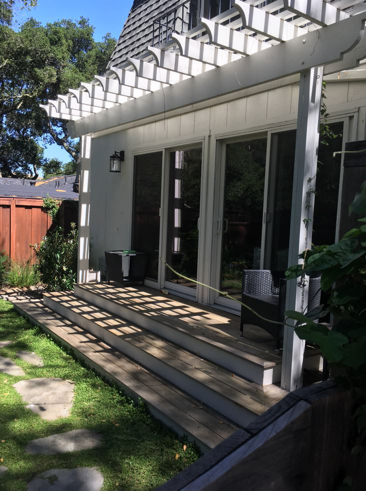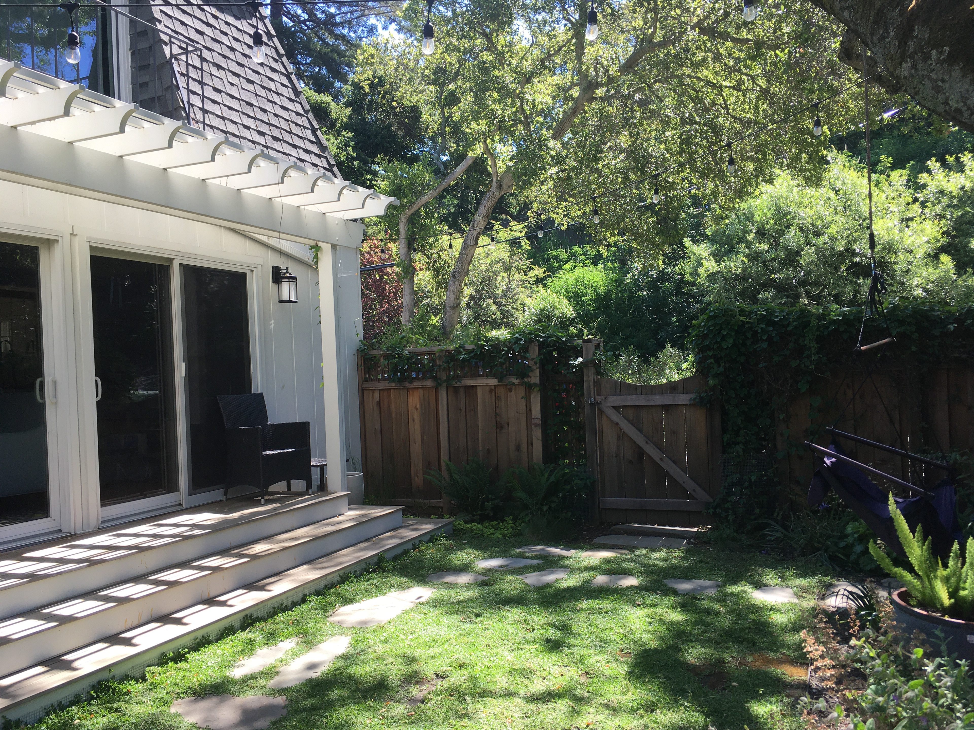 An grand old Coast Live Oak stands sentinel over this tiny garden, providing an opportunity to create a shady low-water native plant habitat (Vine Maple, Snowberry, Sword Ferns, Douglas Iris, Pitcher Sage, Coral Bells etc.), as well as a small family play space using drought-tolerant Kurapia. The mansard roof and Live Oak provided the opportunity to play with scale, form and enclosure using new carpentry elements to create a sweet private refuge outside the home's living room doors.