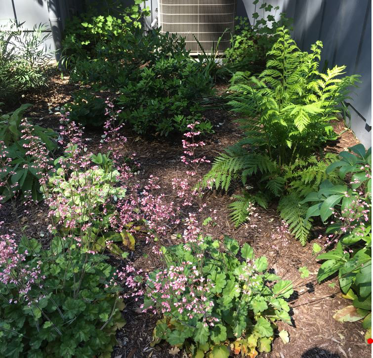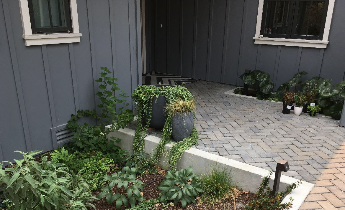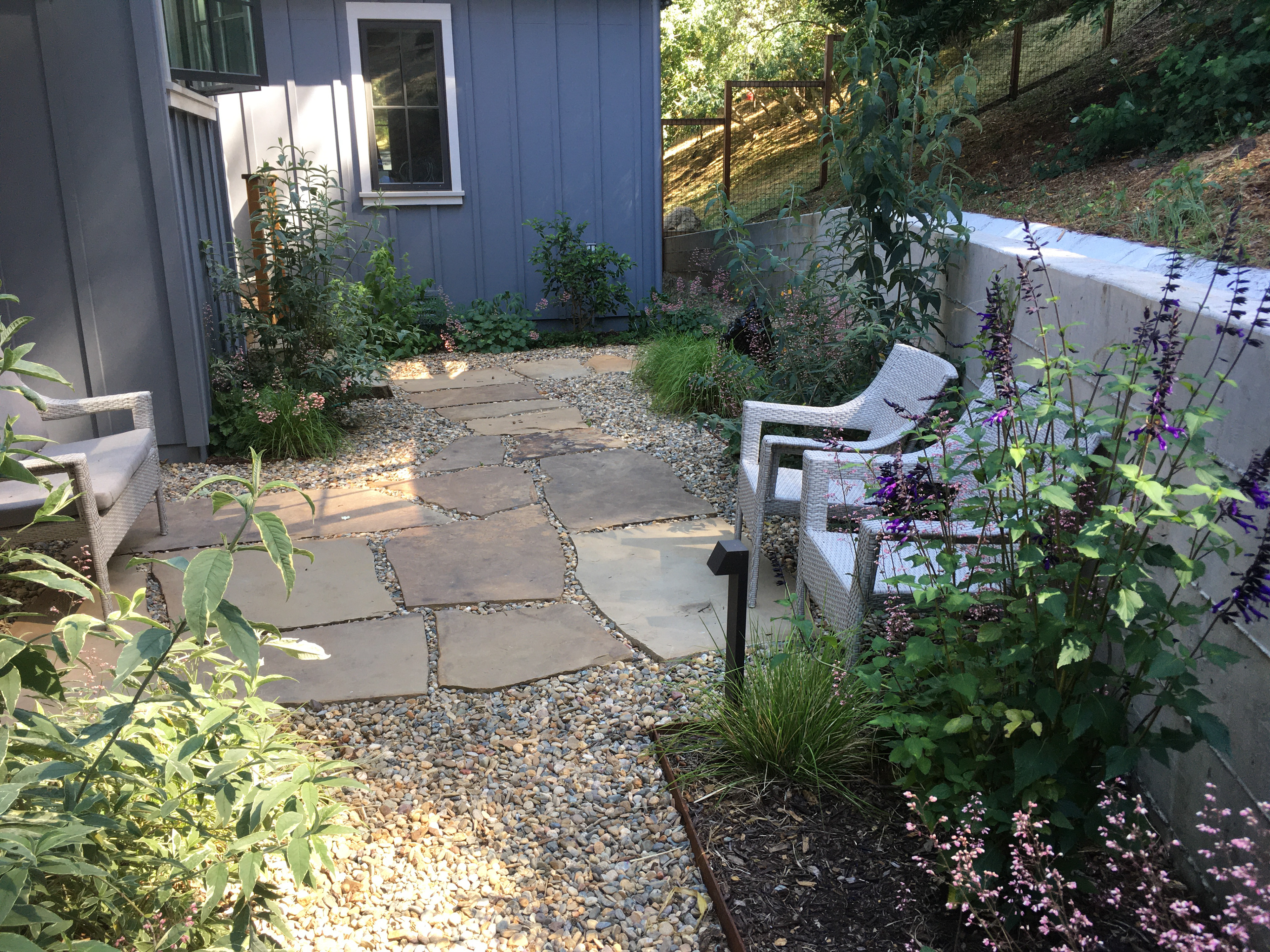 At first sight, I recognized the metal roof and large drop-off could easily accommodate rainwater catchment cisterns. The homeowners agreed that using stored rainwater for their supplemental irrigation needs fit their vision to develop the site as sustainably as possible. The harvested rainwater keeps a mostly-native garden flourishing through the Summer heat.